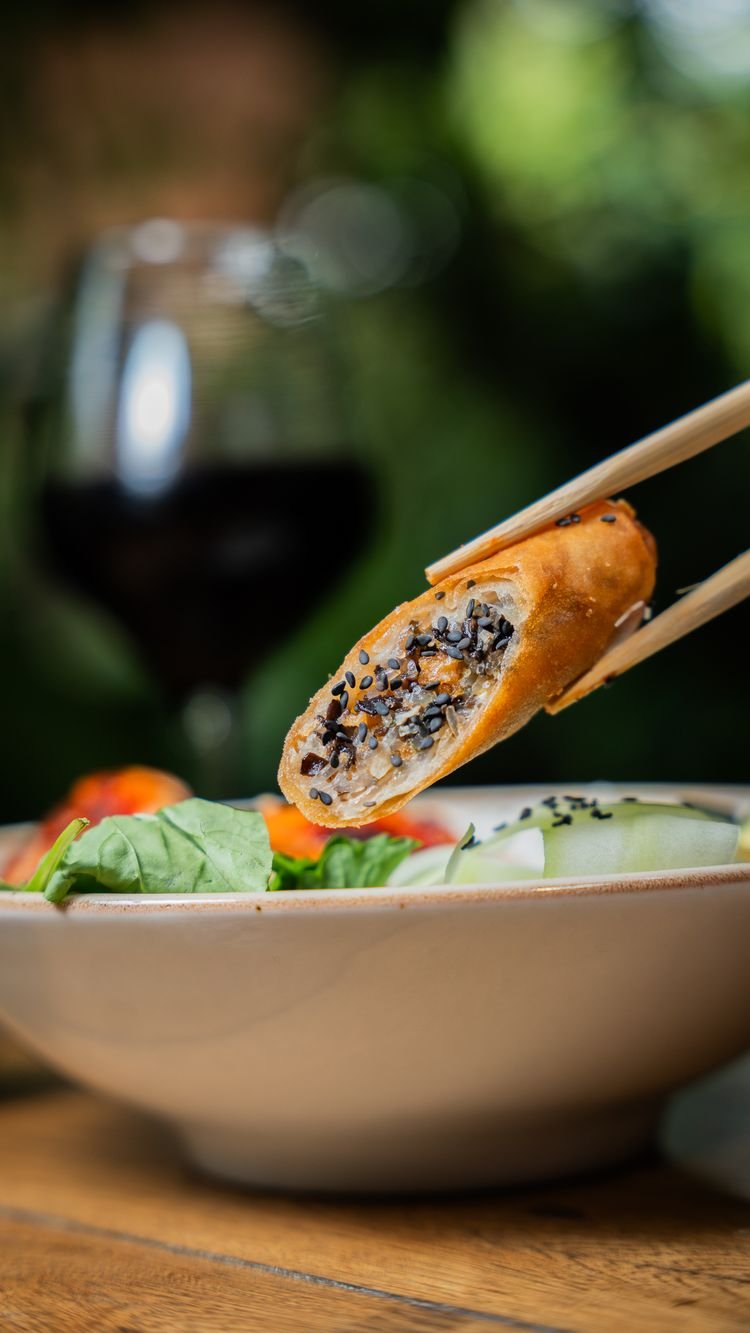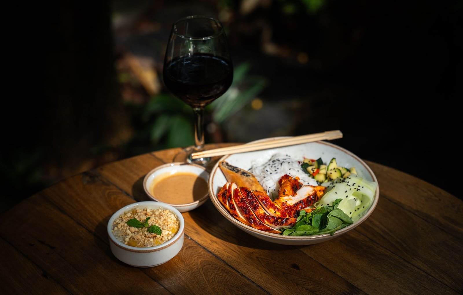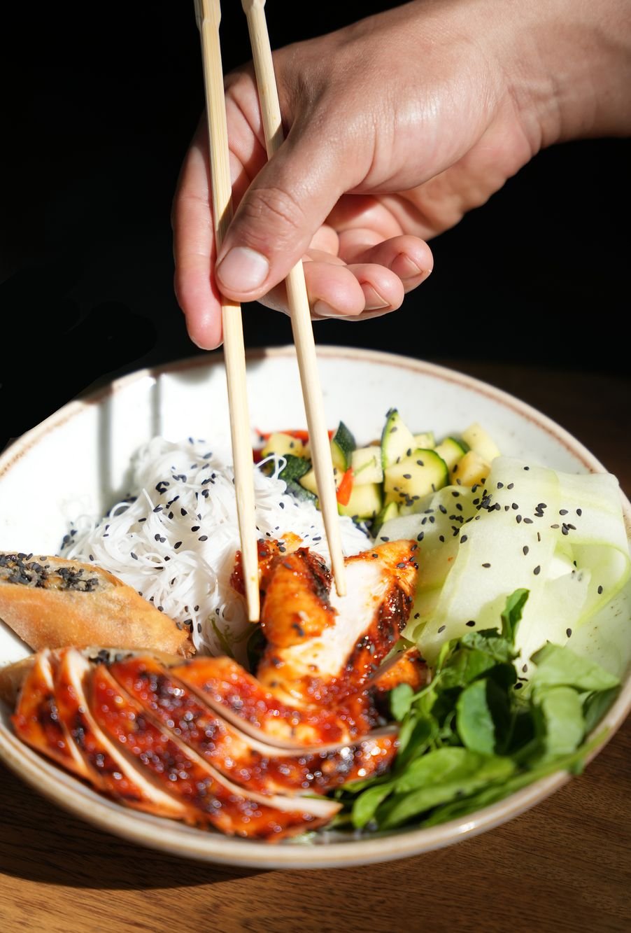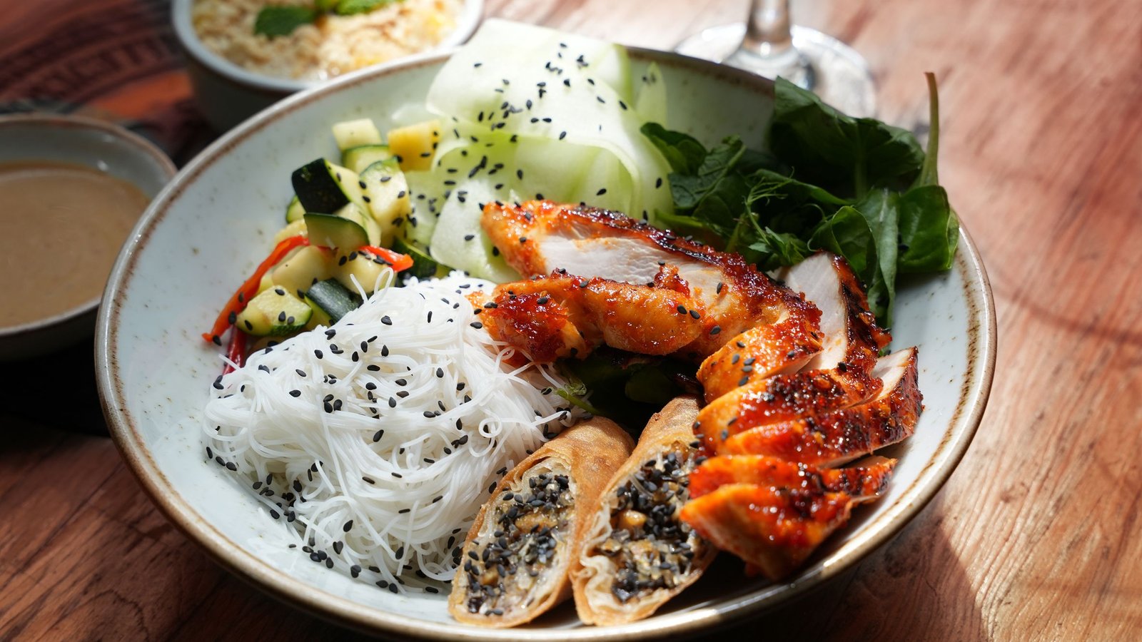 - Bun ga nuong: Pollo marinado en limonaria y cerveza, acompañado de lumpia de hongo negro, zucchini encurtido, pepino, mezclum y vermicelli de arroz.