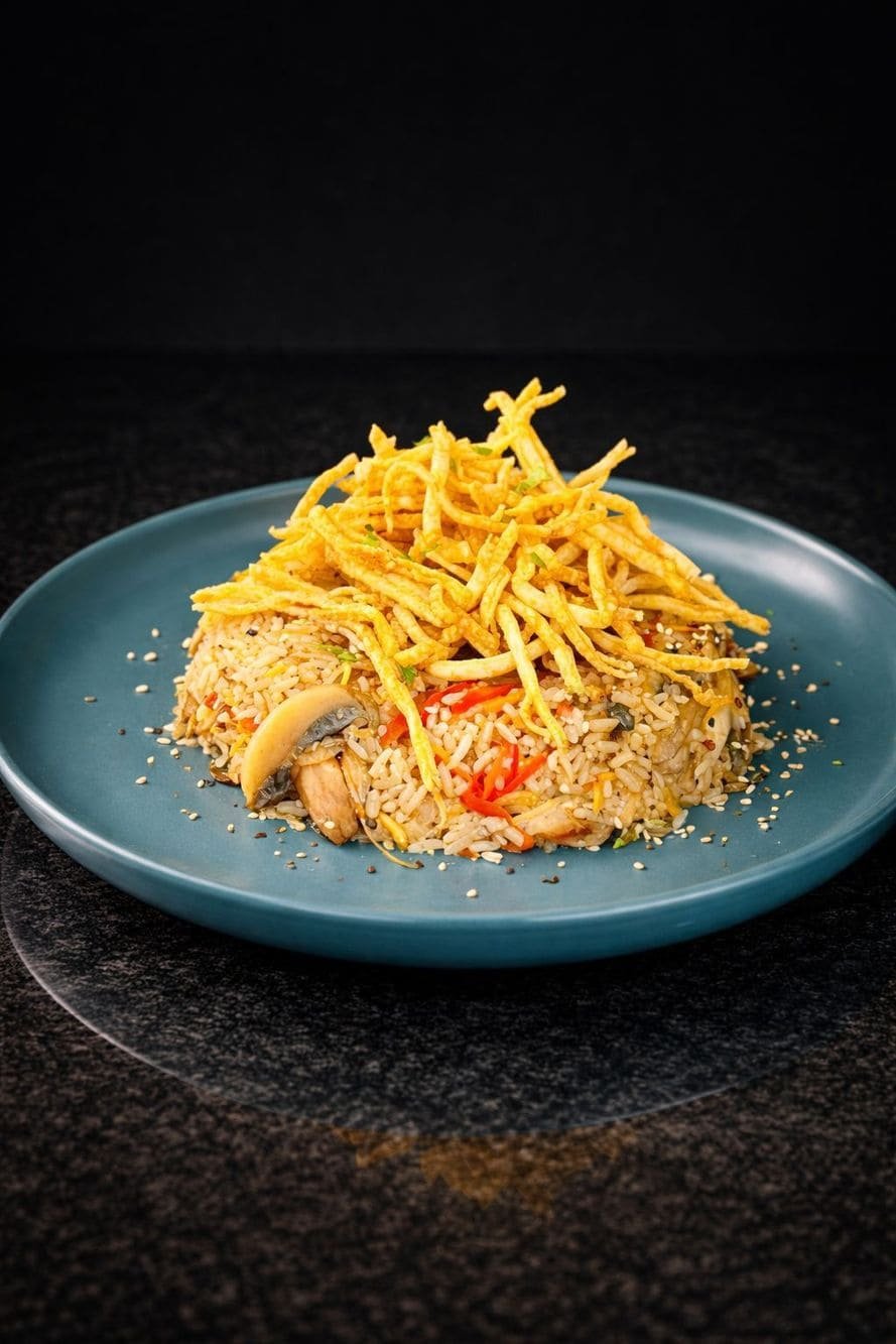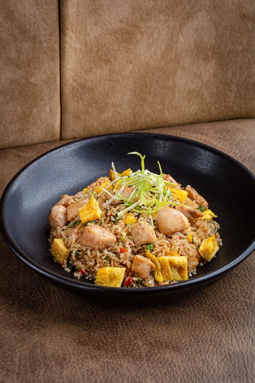 - Arroz oriental de pollo al wok: Arroz salteado al wok a fuego alto, impregnado con soya y delicados insumos orientales, acompañado de jugosos trozos de pollo, vegetales frescos y finas tiras de tortilla de huevo. Un plato aromático y balanceado, de inspiración asiática, donde el salteado rápido resalta sabores intensos, texturas suaves y un carácter reconfortante y elegante.