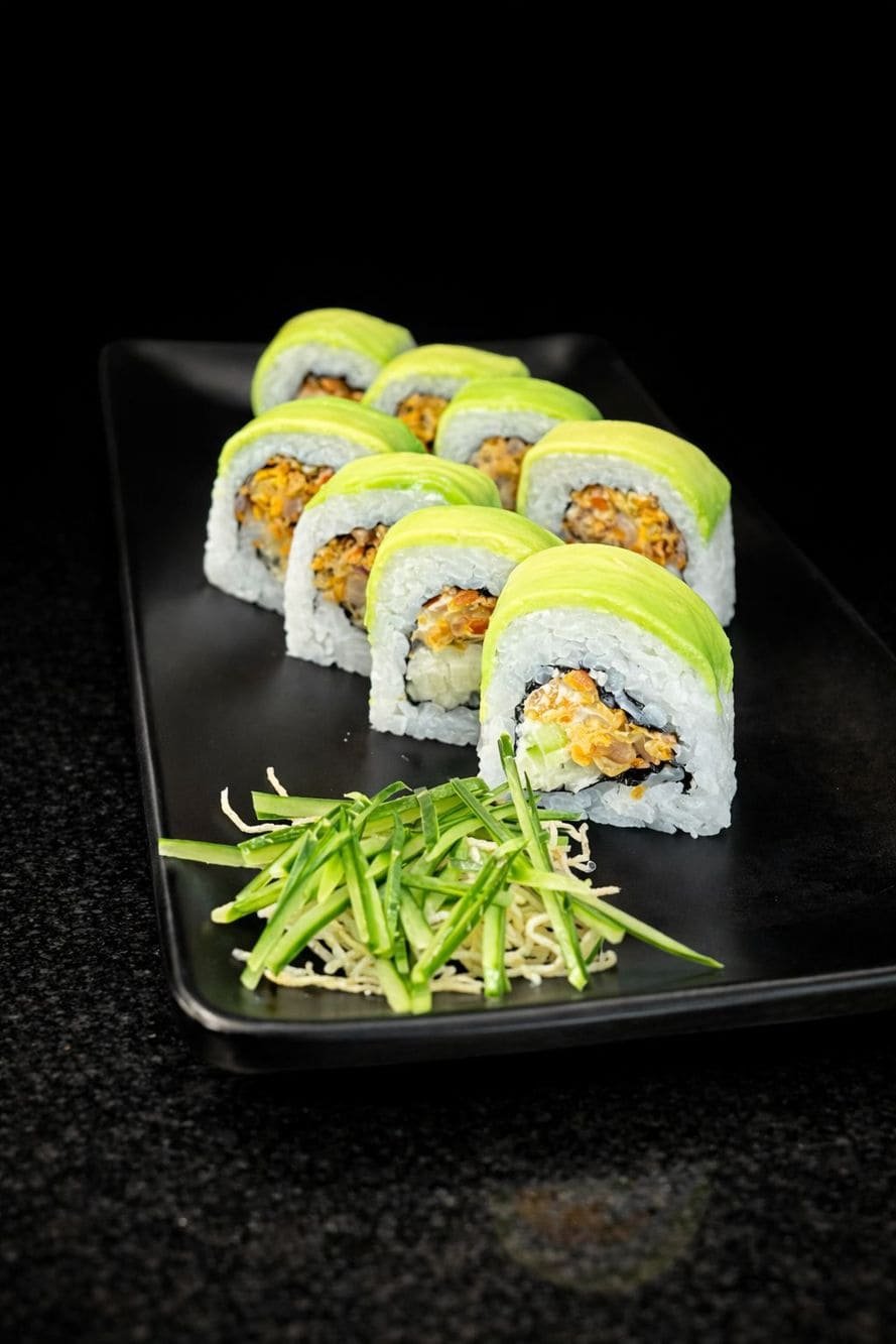 - Nikkei green roll: Rollo vegetariano de arroz de sushi, relleno de pepino, queso crema y vegetales en tempura, coronado con aguacate fresco. Una propuesta nikkei que combina crocancia, cremosidad y frescura en un equilibrio sutil y sofisticado.