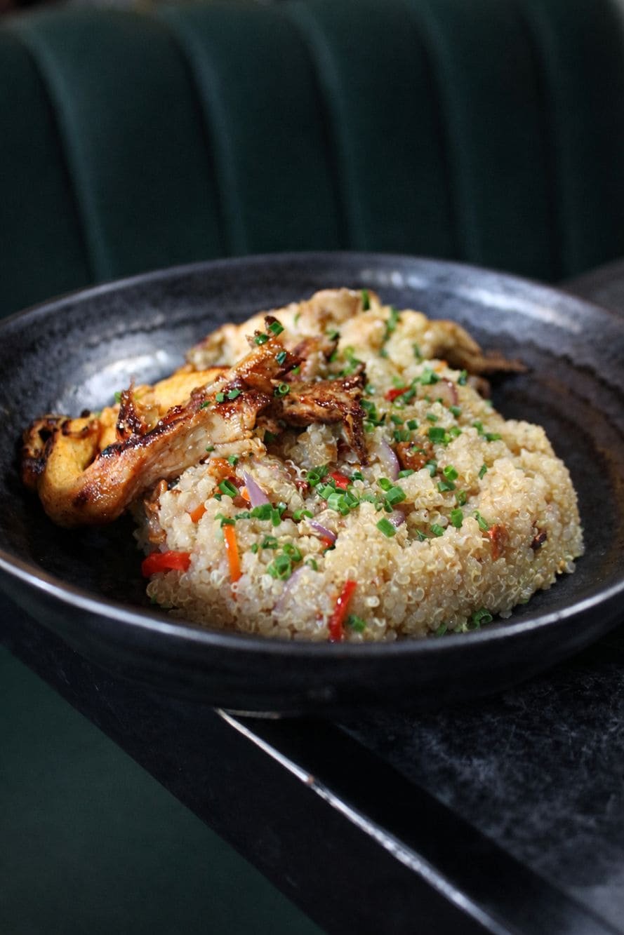 - Quinoto qori: Quinua cocida lentamente hasta lograr una textura cremosa, acompañada de verduras salteadas y un toque de aceite de oliva y ajo que realza el sabor de forma natural. ¡Un plato equilibrado y reconfortante, de clara inspiración andina! Disponible con proteína a elección: Orellana, atún, salmón o pollo (según disponibilidad).